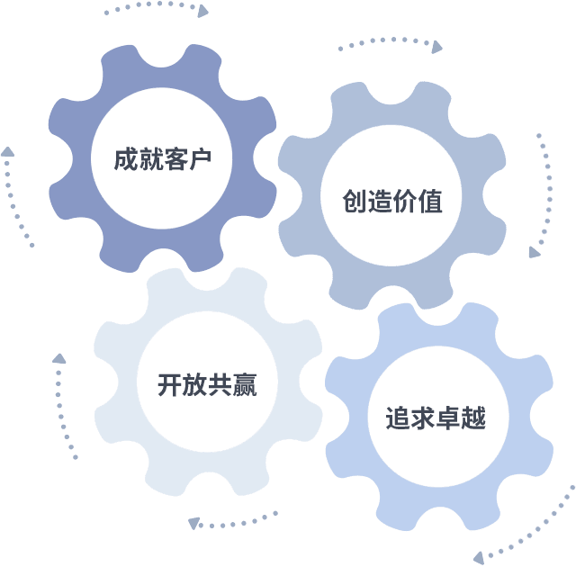 成就客户是一切决策的出发点,,,创造价值是衡量所有工作的标准,,,追求卓越是我们做事做人的态度,,,开放共赢是我们的格局也是最终的结果。。。价值观的齿轮环环相扣,,,,推动着组织里的每个人不断向前。。。。